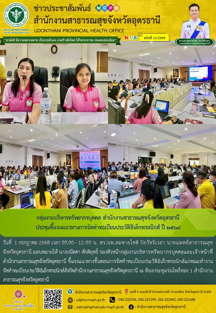 ประชุมชี้แจงแนวทางการจัดทำทะเบียนประวัติอิเล็กทรอนิกส์ ปี 2568 วันที่ 1 กรกฎาคม 2568 เวลา 09.00 - 12.00 น. ดร.นพ.สมชายโชติ ปิยวัชร์เวลา นายแพทย์สาธารณสุข จังหวัดอุดรธานี มอบหมายให้ นางปนัดดา ศักดิฤทธิ์ รองหัวหน้ากลุ่มงานบริหารทรัพยากรบุคคลและเจ้าหน้าที่ สำนักงานสาธารณสุขจังหวัดอุดรธานี ชี้แจงแนวทางขั้นตอนการจัดทำทะเบียนประวัติอิเล็กทรอนิกส์แก่คณะทำงาน จัดทำทะเบียนประวัติอิเล็กทรอนิกส์สังกัดสำนักงานสาธารณสุขจังหวัดอุดรธานี ณ ห้องประชุมร่มโพธิ์ทอง 1 สำนักงานสาธารณสุขจังหวัดอุดรธานี