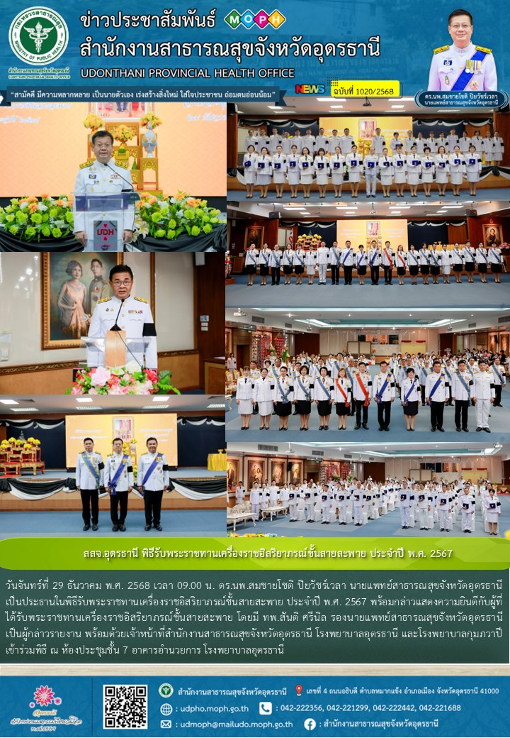 วันจันทร์ที่ 29 ธันวาคม พ.ศ. 2568 เวลา 09.00 น. ดร.นพ.สมชายโชติ ปิยวัชร์เวลา นายแพทย์สาธารณสุขจังหวัดอุดรธานี เป็นประธานในพิธีรับพระราชทานเครื่องราชอิสริยาภรณ์ชั้นสายสะพาย ประจำปี พ.ศ. 2567 พร้อมกล่าวแสดงความยินดีกับผู้ที่ได้รับพระราชทานเครื่องราชอิสริยาภรณ์ชั้นสายสะพาย โดยมี ทพ.สันติ ศรีนิล รองนายแพทย์สาธารณสุขจังหวัดอุดรธานี เป็นผู้กล่าวรายงาน พร้อมด้วยเจ้าหน้าที่สำนักงานสาธารณสุขจังหวัดอุดรธานี โรงพยาบาลอุดรธานี และโรงพยาบาลกุมภวาปี เข้าร่วมพิธี ณ ห้องประชุมชั้น 7 อาคารอำนวยการ โรงพยาบาลอุดรธานี
