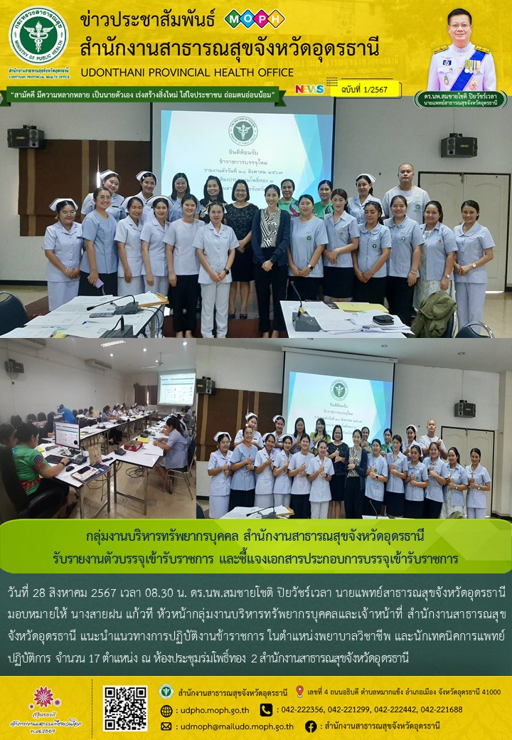 รับรายงานตัวบรรจุเข้ารับราชการ และชี้แจงเอกสารประกอบการบรรจุเข้ารับราชการ วันที่ 28 สิงหาคม 2567 เวลา 08.30 น. ดร.นพ.สมชายโชติ ปิยวัชร์เวลา นายแพทย์สาธารณสุขจังหวัดอุดรธานี มอบหมายให้ นางสายฝน แก้วที หัวหน้ากลุ่มงานบริหารทรัพยากรบุคคลและเจ้าหน้าที่ สำนักงานสาธารณสุข จังหวัดอุดรธานี แนะนำแนวทางการปฏิบัติงานข้าราชการ ในตำแหน่งพยาบาลวิชาชีพ และนักเทคนิคการแพทย์ปฏิบัติการ จำนวน 17 ตำแหน่ง ณ ห้องประชุมร่มโพธิ์ทอง 2 สำนักงานสาธารณสุขจังหวัดอุดรธานี