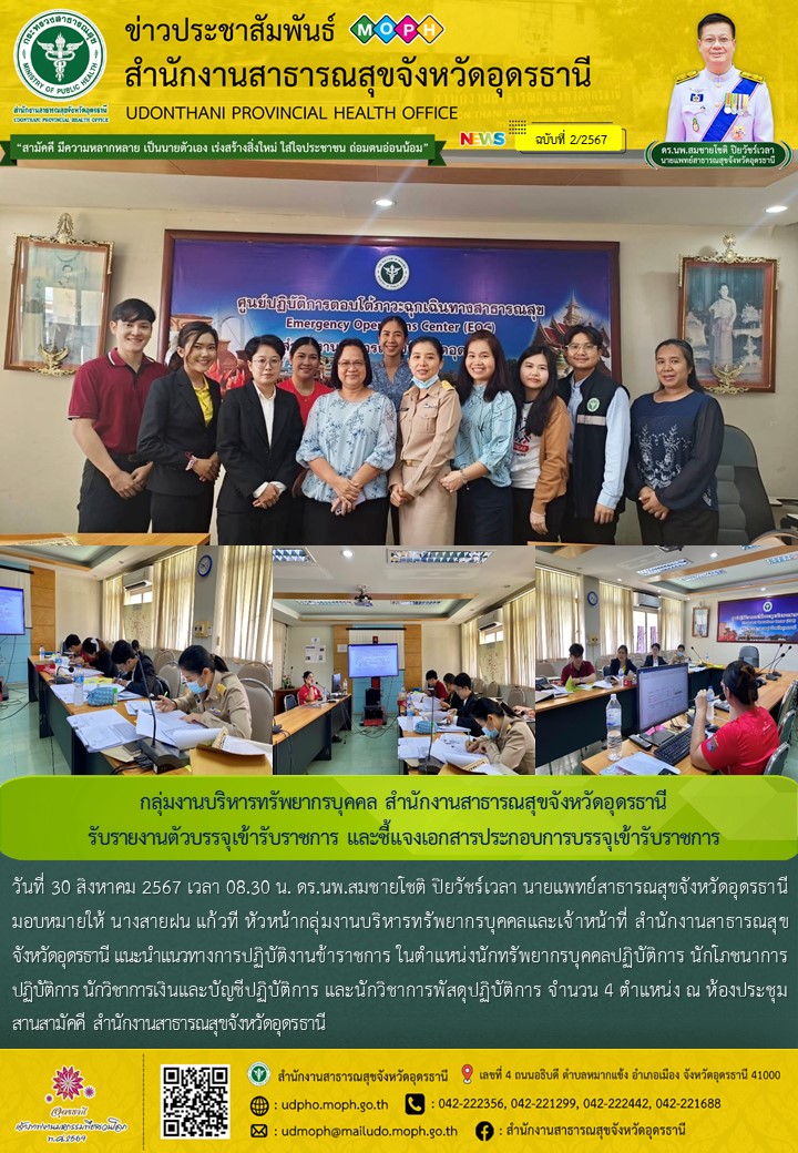 รับรายงานตัวบรรจุเข้ารับราชการ และชี้แจงเอกสารประกอบการบรรจุเข้ารับราชการ วันที่ 30 สิงหาคม 2567 เวลา 08.30 น. ดร.นพ.สมชายโชติ ปิยวัชร์เวลา นายแพทย์สาธารณสุขจังหวัดอุดรธานี มอบหมายให้ นางสายฝน แก้วที หัวหน้ากลุ่มงานบริหารทรัพยากรบุคคลและเจ้าหน้าที่ สำนักงานสาธารณสุข จังหวัดอุดรธานี แนะนำแนวทางการปฏิบัติงานข้าราชการ ในตำแหน่งนักทรัพยากรบุคคลปฏิบัติการ นักโภชนาการปฏิบัติการ นักวิชาการเงินและบัญชีปฏิบัติการ และนักวิชาการพัสดุปฏิบัติการ จำนวน 4 ตำแหน่ง ณ ห้องประชุม สานสามัคคี สำนักงานสาธารณสุขจังหวัดอุดรธานี