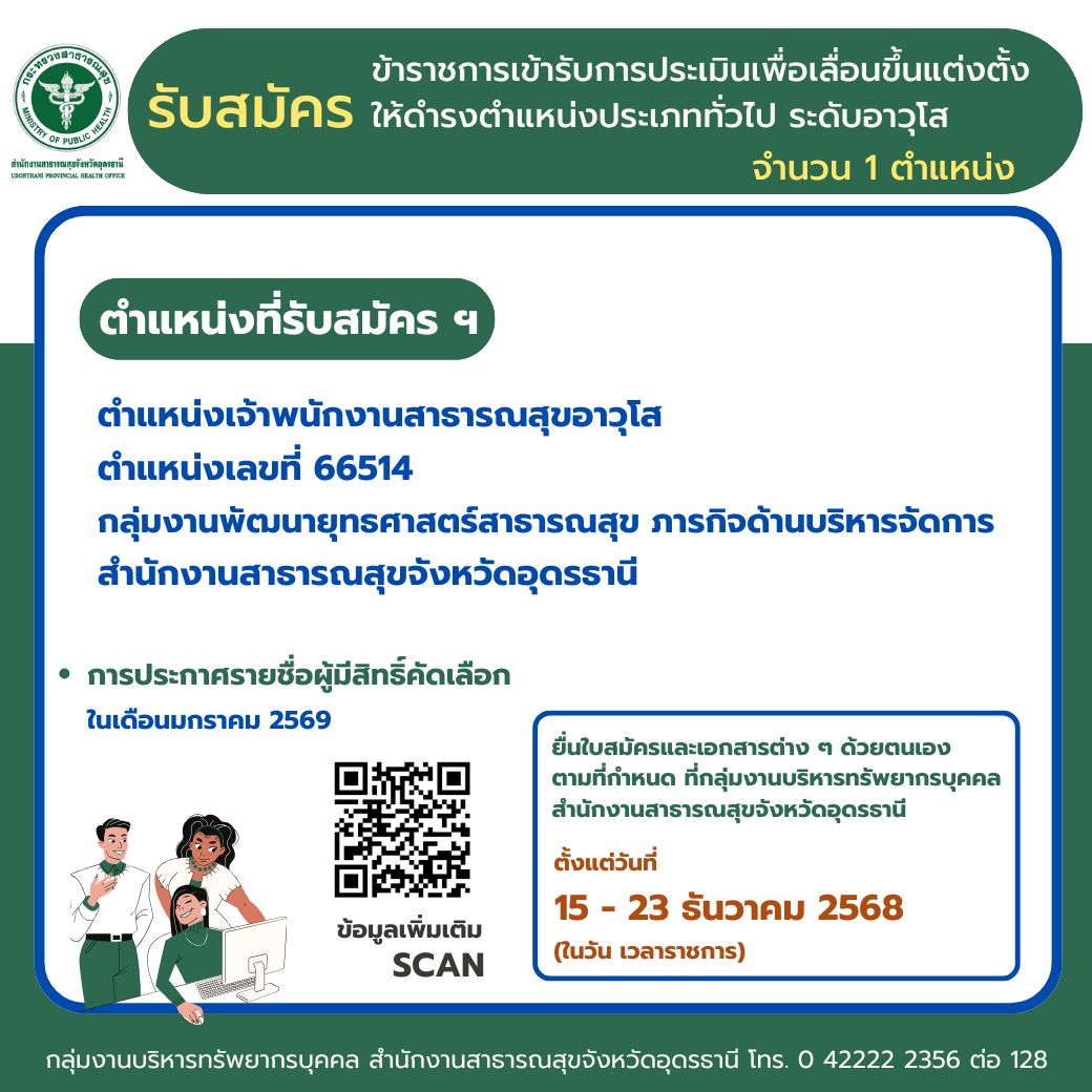 รับสมัครข้าราชการเข้ารับการประเมินเพื่อเลื่อนขึ้นแต่งตั้งให้ดำรงตำแหน่งประเภททั่วไป ระดับอาวุโส ของสำนักงานสาธารณสุขจังหวัดอุดรธานี (1 ตำแหน่ง)