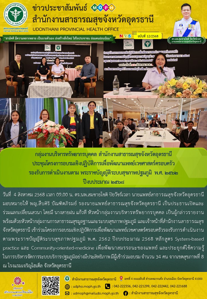 ประชุมโครงการอบรมเชิงปฏิบัติการเพื่อพัฒนาแพทย์เวชศาสตร์ครอบครัว รองรับการดำเนินงานตาม พระราชบัญญัติระบบสุขภาพปฐมภูมิ พ.ศ. 2562 ปีงบประมาณ 2568 วันที่ 4 สิงหาคม 2568