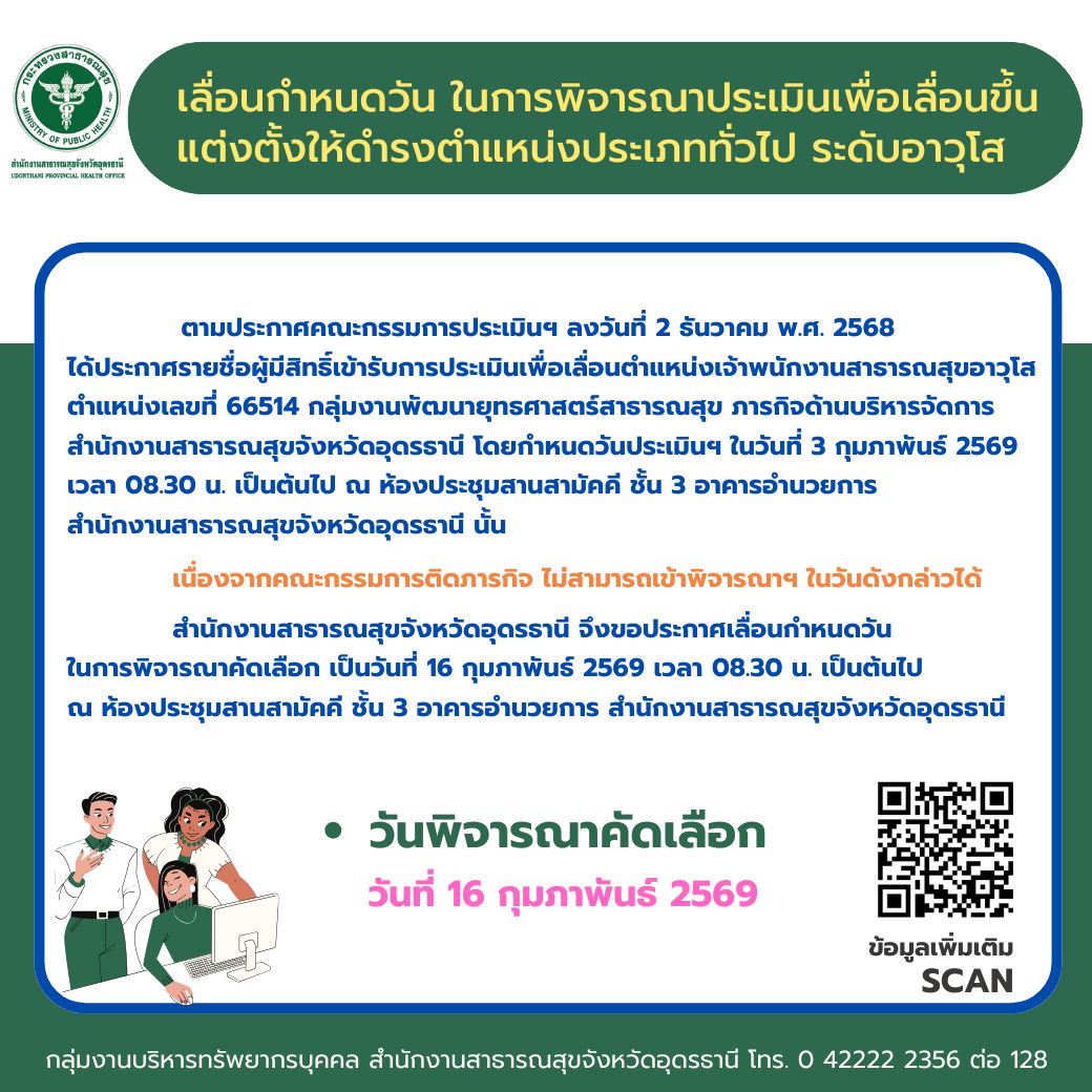 เลื่อนกำหนดวัน ในการพิจารณาประเมินเพื่อเลื่อนขึ้นแต่งตั้งให้ดำรงตำแหน่งประเภททั่วไป ระดับอาวุโส